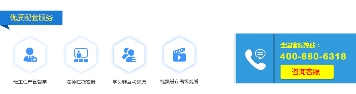 自有培訓(xùn)輔導(dǎo)資料、多位經(jīng)驗豐富培訓(xùn)老師,課程內(nèi)容豐富。一對一復(fù)習(xí)計劃、郵寄紙質(zhì)資料、提供配套習(xí)題練習(xí)和考前沖刺資料、班主任一對一學(xué)習(xí)監(jiān)督、隨時向老師提問等服務(wù)。